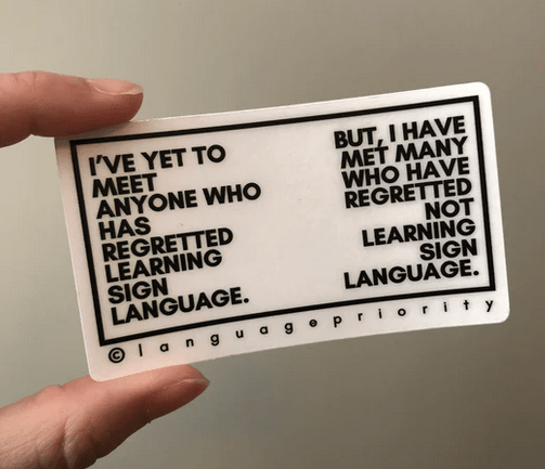 Language Priority has a sticer that says, “I’ve yet to meet anyone who has regretted learning sign language. But, I have met many who have regretted not learning sign language.”